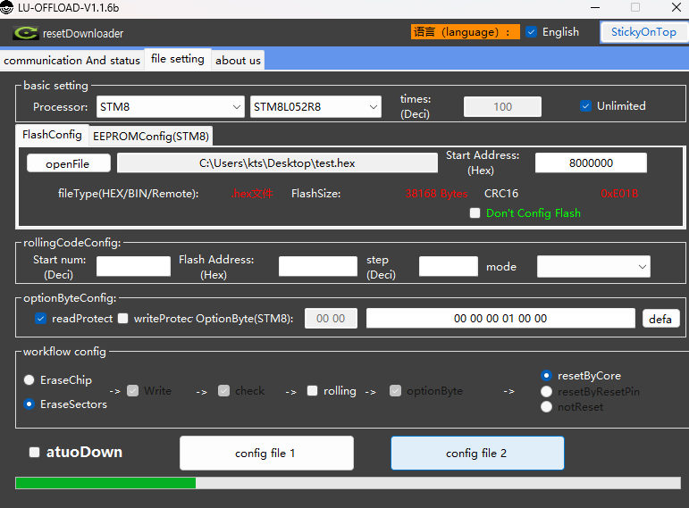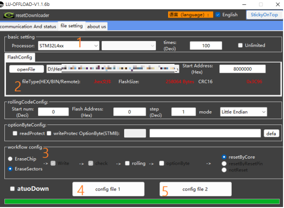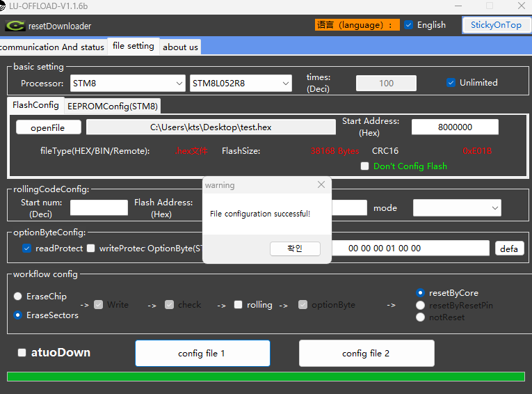 3. 다운로더 설정.. EraseChip 하는 경우는 기존 데이터까지 다 날라가므로, EraseSectors 로 선택