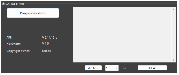 연결 후 프로그램 info 누르면 하기와 같이 버전 정보 및 내부 저장된 펌웨어 파일 확인 가능함