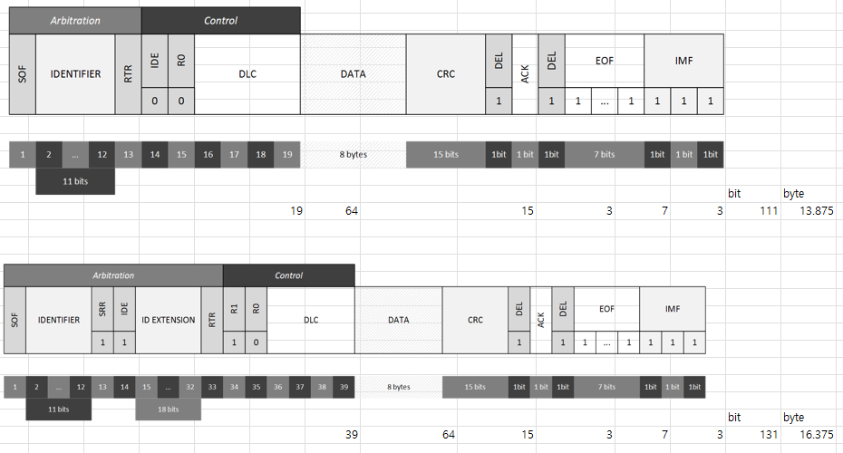 2.0A 표준 , 2.0B 확장 프레임 2종류가 있는데, 전송 데이터 8byte 기준 1ms 당 전송 횟수는 하기와 같음 data 8byte (64bit) Mbps bps byte 1ms byte Cnt ext. frame (2.0B) std. frame (2.0A) 1 1000000 125000 125 7.668711656 9.057971014 0.5 500000 62500 62.5 3.834355828 4.528985507 0.25 250000 31250 31.25 1.917177914 2.264492754 0.125 125000 15625 15.625 0.958588957 1.132246377 1Mbps 기준, 1ms 에 ext. 기준 7.6회 전송할수 있음. 기타 여러 조건 감안하여 7회 라고 봐..