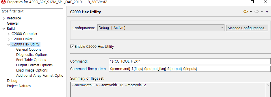 TI 전용 다운프로그램 전달합니다. (CCS 프로그램으로 다운 불필요) https://www.ti.com/tool/UNIFLASH#downloads 다운 후 설치 실행하면 자동으로 디버그 장치 연결되고 해당 디바이스 선택 (28027) 스타트 버튼 활성화 되면 클릭 후 *.out 파일 선택 후 load image 버튼으로 펌웨어 업로드 정상적으로 펌웨어 다운되면 하기 콘솔창에 메시지 출력됨. CCS hex 만들기 C2000 hex 활성화, 메모리 16, 16 출력 모토로라 2